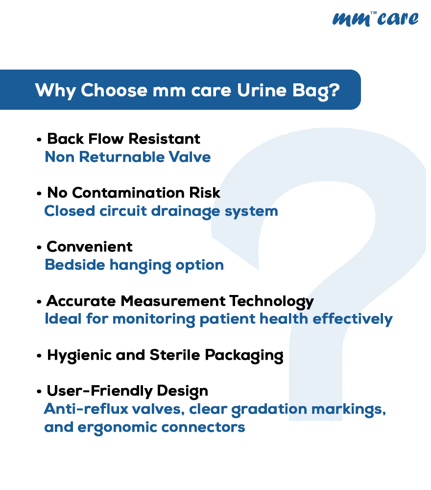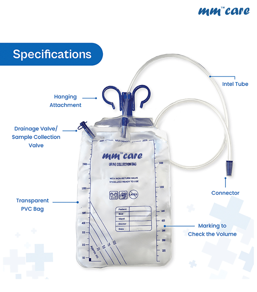 The MM Care™ Urine Collection Bag is a dependable and hygienic urinary drainage solution for patients with mobility limitations, surgical recovery, or chronic incontinence. Designed for ease of use, it features a large 2000 ml capacity, a 90 cm kink-resistant drainage tube, and a leak-proof system to ensure safe, mess-free urine collection in hospital, care home, or home care settings.